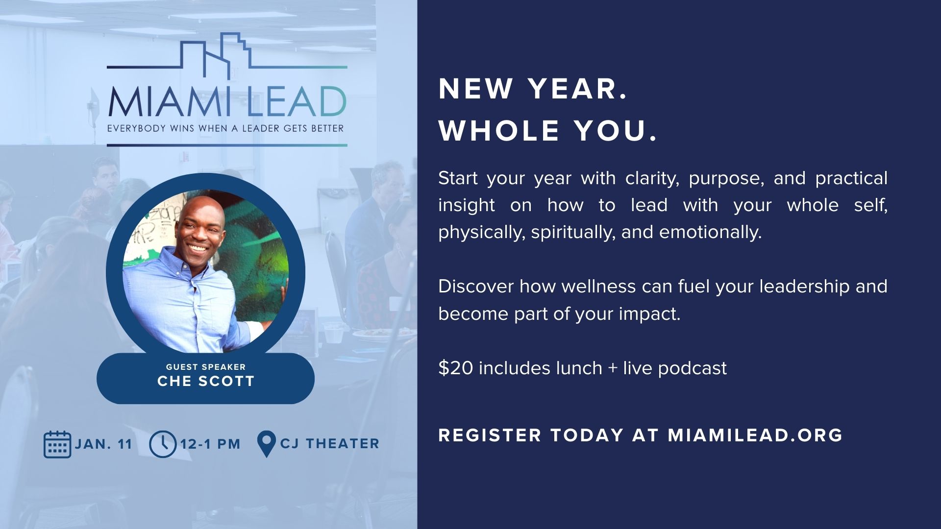 We’re kicking off the year with a conversation that goes deeper than resolutions, because the most effective leaders lead from a place of wholeness. Join us at Miami Lead as we welcome Che Scott, Chaplain for the Miami Heat and Director of Spiritual Life at Chapman Partnership, serving the homeless community in Miami.